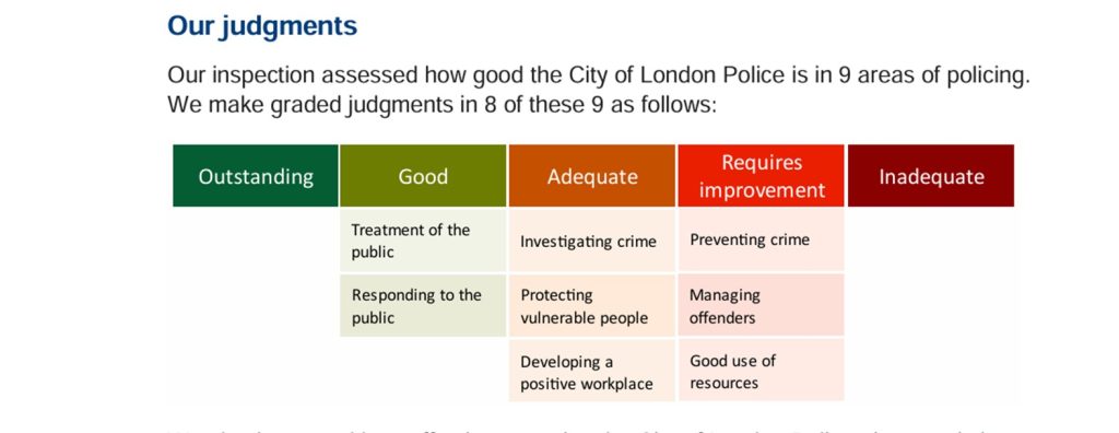 Member of the City of London Police Authority Board, Ben Murphy, said: “The City Police family should feel very proud of the progress which has been achieved since the last inspection. The PEEL report published today makes the City of London Police one of only a handful of police forces in the UK without a ‘requires improvement’ score for this inspection period. Recognising the ‘outstanding’ grading in how the City Police record data about crime gives further validity to the robustness of its other inspection scores. Of course, this is not an opportunity to kick back and relax – as both a local policing team, responsible for keeping the Square Mile safe, and as the National Lead Force for fraud and economic crime, we must continue to push for further improvements outlined in our Policing Plan.”